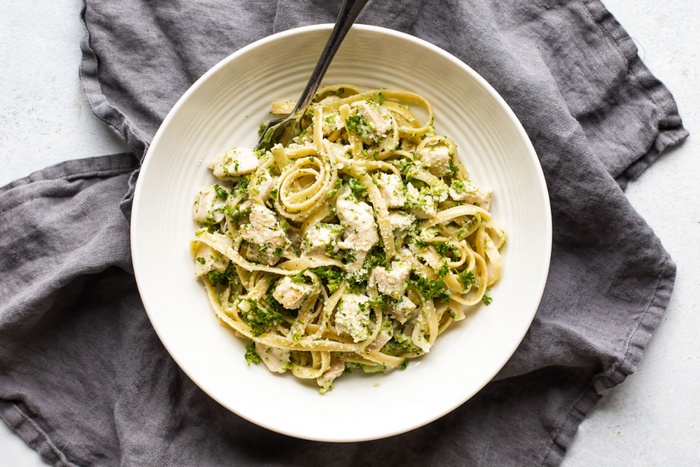 pasta, paprika, carrot, green beans, chicken breast, onion, garlic, cream, parsley, rosemary, salt, pepper, chicken stock.